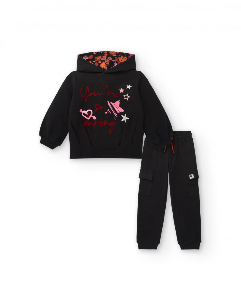 Conjunto para niña compuesto por una sudadera negra con capucha y un pantalón de chándal a juego, ideal para un look casual con un toque atrevido. La sudadera luce un estampado en el pecho con estrellas, corazones y la frase «You’re so Daring» en colores vibrantes que contrastan con el fondo oscuro. El interior de la capucha tiene un forro con estampado floral que le da un toque único al conjunto. El pantalón de chándal, con bolsillos cargo y cintura ajustable con cordón, completa el conjunto a la perfección, ofreciendo comodidad y estilo para cualquier ocasión.